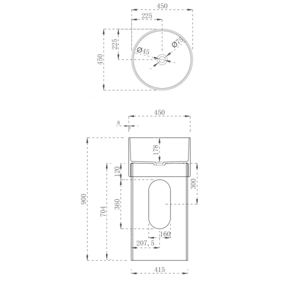 Напольная раковина с техническим отверстием для монтажа у стены.