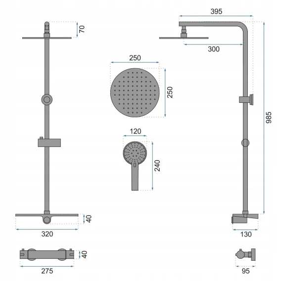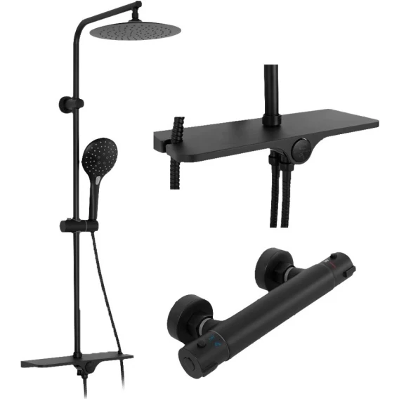 Металлическая розетка, Эксцентрики, Душевой шланг, Душевая лейка, Держатель для душевой лейки, Полочка, Верхний душ, Кронштейн, Штанга душевая, Термостат