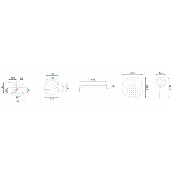 Душевой шланг, Душевая лейка, Держатель для душевой лейки, Подключение для душевого шланга, Верхний душ, Скрытая монтажная часть, Смеситель, Кронштейн