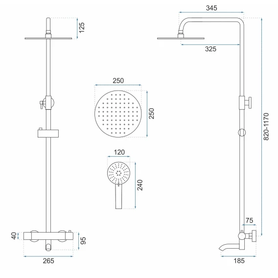 Аэратор, Металлическая розетка, Эксцентрики, Душевой шланг, Душевая лейка, Держатель для душевой лейки, Верхний душ, Кронштейн, Штанга душевая, Термостат