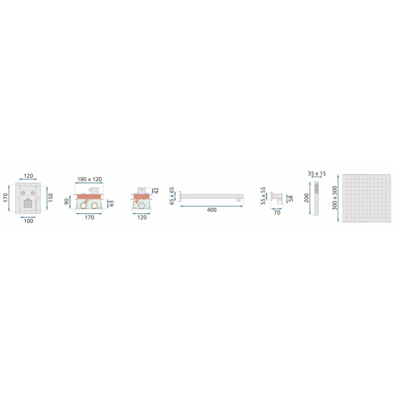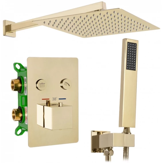Душевой шланг, Душевая лейка, Подключение для душевого шланга с держателем, Верхний душ, Скрытая монтажная часть, Кронштейн, Термостат