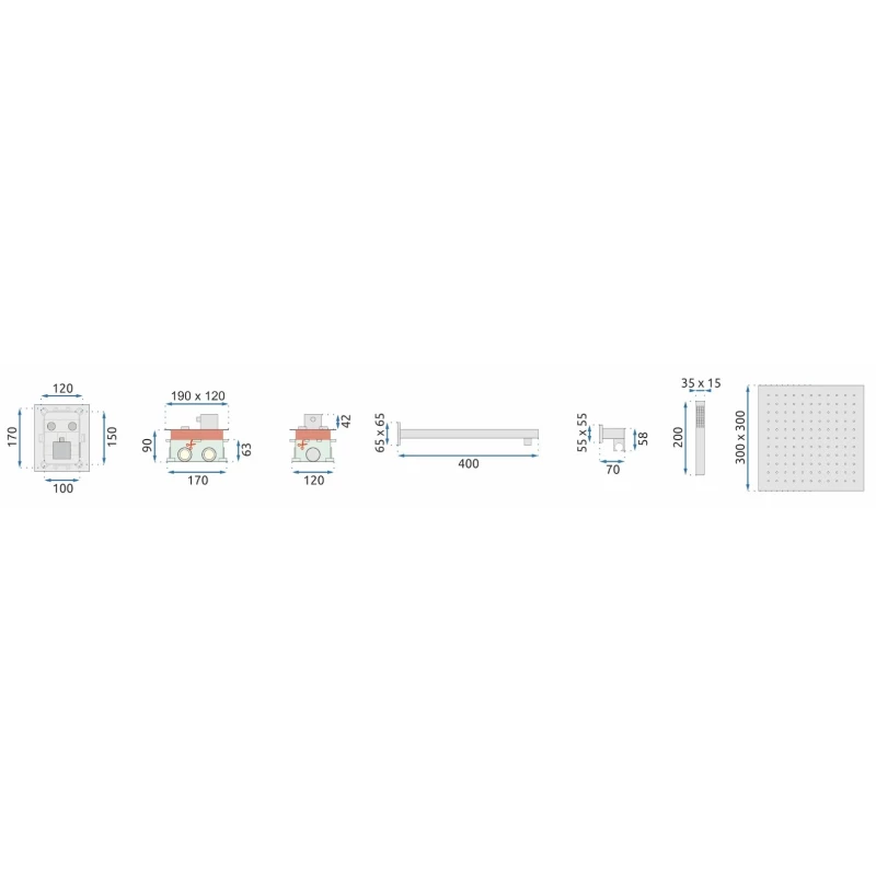 Душевой шланг, Душевая лейка, Подключение для душевого шланга с держателем, Верхний душ, Скрытая монтажная часть, Кронштейн, Термостат