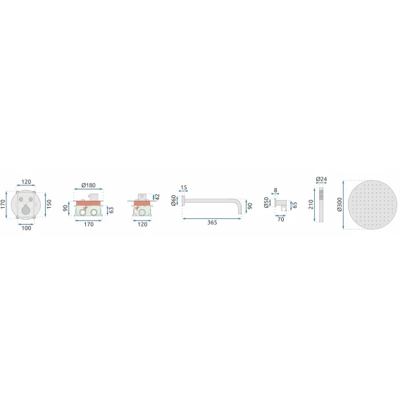 Душевой шланг, Душевая лейка, Подключение для душевого шланга с держателем, Верхний душ, Скрытая монтажная часть, Кронштейн, Термостат