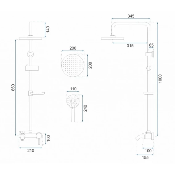 Аэратор, Металлическая розетка, Эксцентрики, Душевой шланг, Душевая лейка, Держатель для душевой лейки, Верхний душ, Смеситель, Кронштейн, Мыльница, Штанга душевая