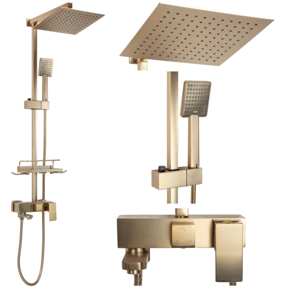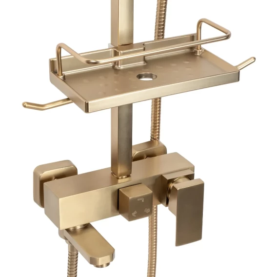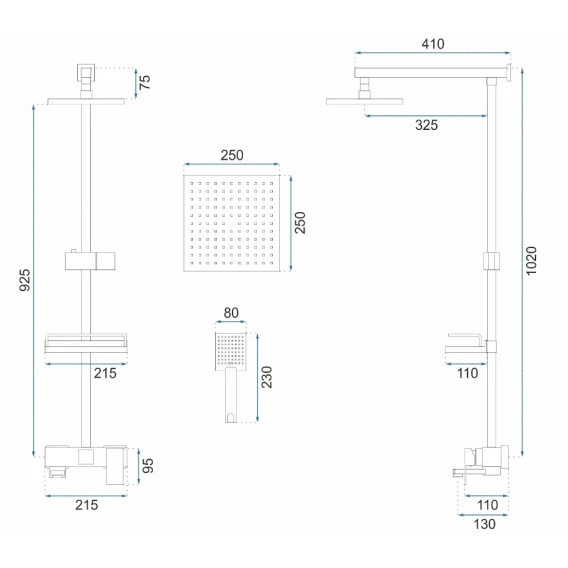 Аэратор, Металлическая розетка, Эксцентрики, Душевой шланг, Душевая лейка, Держатель для душевой лейки, Полочка, Верхний душ, Крючок, Смеситель, Кронштейн, Штанга душевая