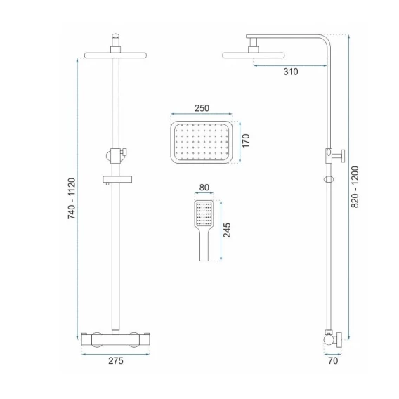 Металлическая розетка, Эксцентрики, Душевой шланг, Душевая лейка, Держатель для душевой лейки, Верхний душ, Кронштейн, Штанга душевая, Термостат