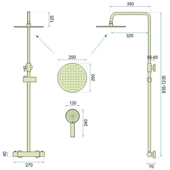 Металлическая розетка, Эксцентрики, Душевой шланг, Душевая лейка, Держатель для душевой лейки, Верхний душ, Кронштейн, Штанга душевая, Термостат