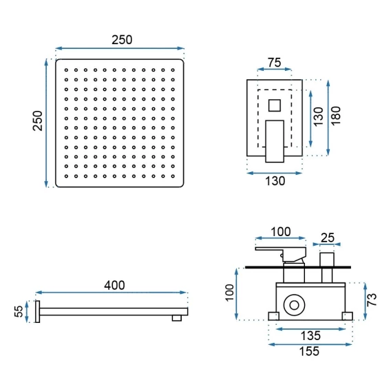 Душевой шланг, Душевая лейка, Подключение для душевого шланга с держателем, Верхний душ, Скрытая монтажная часть, Смеситель, Кронштейн