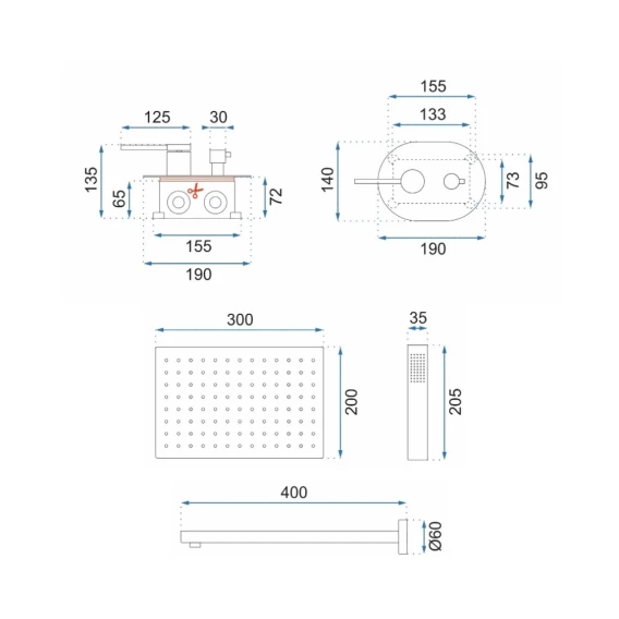 Душевой шланг, Душевая лейка, Подключение для душевого шланга с держателем, Верхний душ, Скрытая монтажная часть, Смеситель, Кронштейн