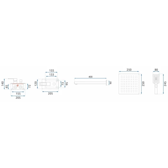 Душевой шланг, Душевая лейка, Подключение для душевого шланга с держателем, Верхний душ, Скрытая монтажная часть, Смеситель, Кронштейн