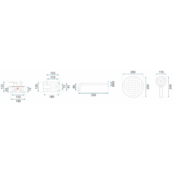 Душевой шланг, Душевая лейка, Подключение для душевого шланга с держателем, Верхний душ, Скрытая монтажная часть, Смеситель, Кронштейн