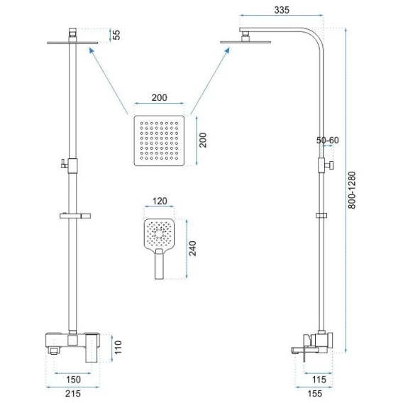 Аэратор, Металлическая розетка, Эксцентрики, Душевой шланг, Душевая лейка, Держатель для душевой лейки, Верхний душ, Смеситель, Кронштейн, Штанга душевая