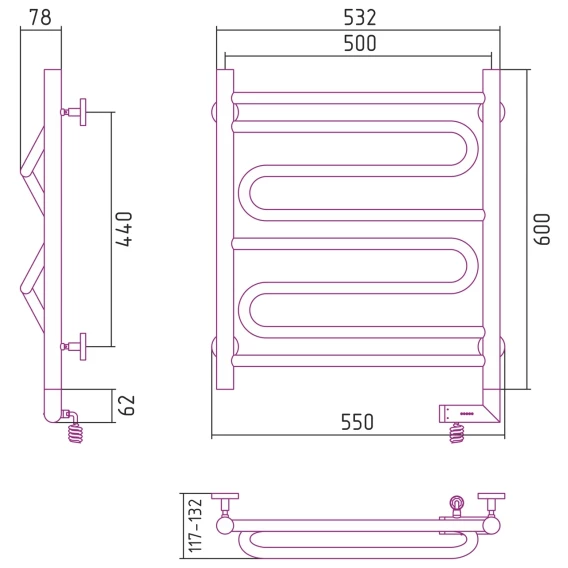 Полотенцесушитель электрический 600x500 МЭМ правый Сунержа Элегия 2.0 00-5219-6050