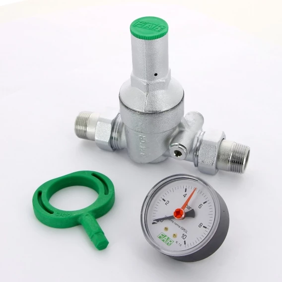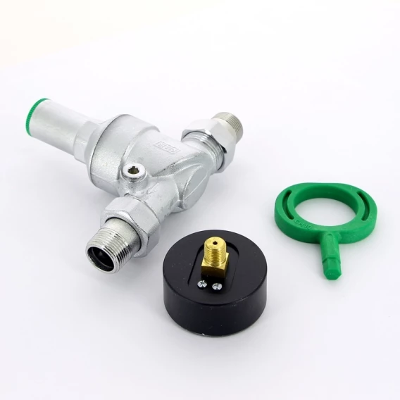 Редуктор мембранного типа. Предназначен для поддержания постоянного давления в системах горячего и холодного водоснабжения. Благодаря постоянному давлению в системе на заданном уровне исключается возможность повреждения сантехнического оборудования и бытовой техники. Максимальная температура: 75 С. Максимальное входное давление: 25 бар. Регулируемое давление после редуктора: от 1 до 6 бар. В комплекте: регулировочный ключ и манометр.