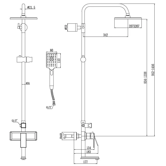Аэратор, Металлическая розетка, Эксцентрики, Душевой шланг, Душевая лейка, Держатель для душевой лейки, Верхний душ, Смеситель, Кронштейн, Штанга душевая