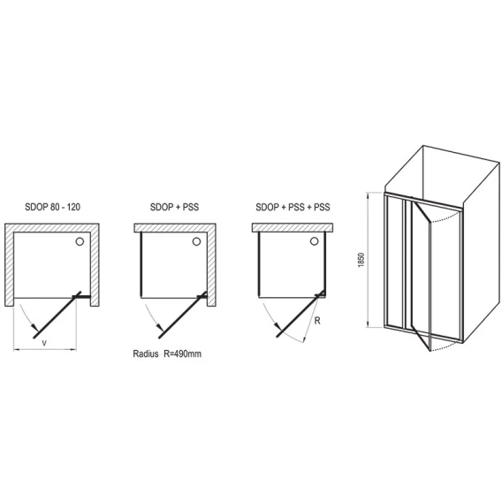 • Комбинируя одну неподвижную стенку типа PSS с душевыми дверьми можно создать «Г»-образный душевой уголок.