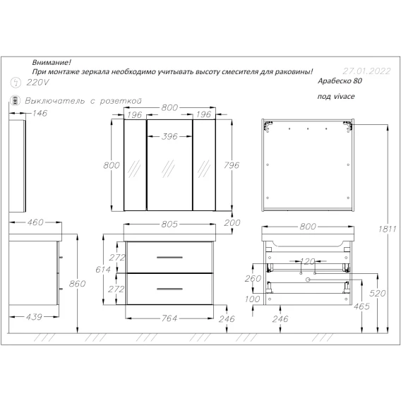 Механизм доводчика, Ящик, Полочка, Ручки, Зеркало-шкаф, Выключатель, Розетка, Тумба под раковину, Раковина
