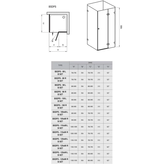 Изделие состоит из двухэлементной двери (одна неподвижная часть и одна подвижная, образующая дверь поворотного типа) и одноэлементной неподвижной стенки. Левый или правый варианты открывания дверей определяются тем, на какой стороне, при виде снаружи, находятся петли. Устанавливается в облицованный кафелем угол ванной комнаты на поддоны RAVAK PERSEUS, PERSEUS PRO, PERSEUS PRO FLAT, PERSEUS PRO CHROME, GIGANT PRO, GIGANT PRO FLAT, GIGANT PRO CHROME или непосредственно на пол со встроенным душевым каналом. Душевой уголок BSDPS поставляется в составе: две стенки и одна дверь из безопасного стекла толщиной 8 мм и 6 мм соответственно, пороговая планка - в одной упаковке. Во второй упаковке (B SET) находятся петли, крепления, ручки, монтажный набор и верхние держатели, вид и количество которых зависит от размера изделия (для BSDPS 80/80, 90/90 – 1 длинный держатель, для BSDPS 100/100, 100/80, 110/80 – 1 длинный +1 короткий держатели, для BSDPS 120/80, 120/90 – 2 длинных держателя). Для BSDPS 80/80, 90/90 второй держатель можно приобрести за дополнительную плату.