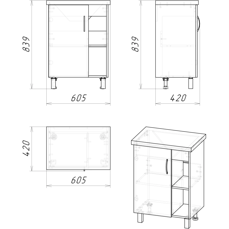 Механизм доводчика, Полочка, Ручка, Ножки, Зеркало, Столешница, Тумба под раковину, Раковина