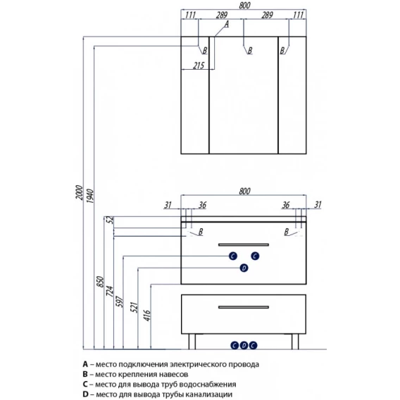 Механизм доводчика, Ящик, Полочка, Подсветка, Зеркало-шкаф, Ручка, Тумба под раковину, Раковина