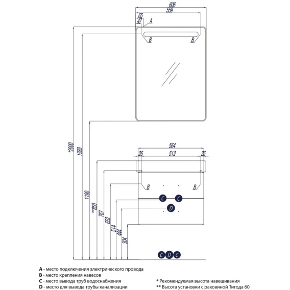 Механизм доводчика, Ящик, Полочка, Ручки, Подсветка, Зеркало-шкаф, Выключатель, Тумба под раковину, Раковина