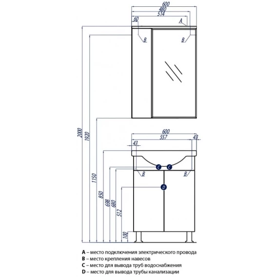 Механизм доводчика, Ящик, Полочка, Ручки, Подсветка, Зеркало-шкаф, Выключатель, Розетка, Тумба под раковину, Раковина