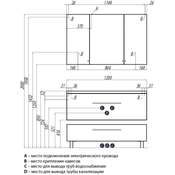 Механизм доводчика, Ящик, Полочка, Подсветка, Зеркало-шкаф, Ручка, Тумба под раковину, Раковина