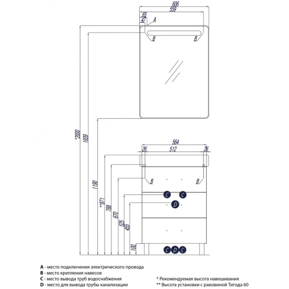 Механизм доводчика, Ящик, Полочка, Ручки, Подсветка, Зеркало-шкаф, Выключатель, Ножки, Тумба под раковину, Раковина