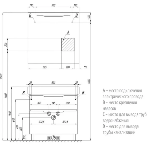 Механизм доводчика, Ящик, Подсветка, Выключатель, Ножки, Зеркало, Тумба под раковину, Раковина