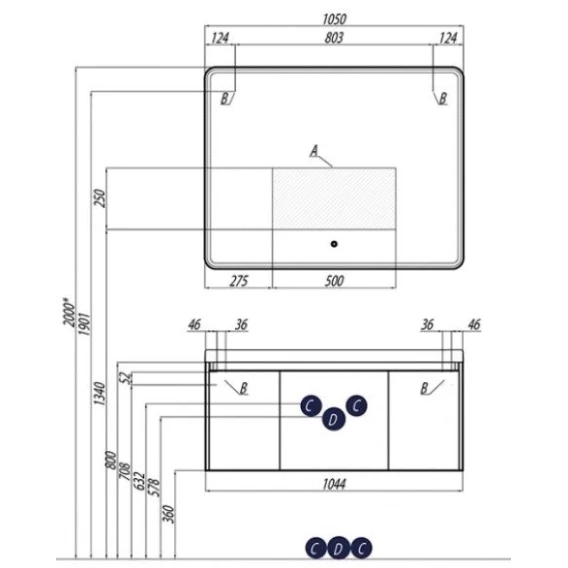 Механизм доводчика, Ящик, Полочка, Подсветка, Сенсорный выключатель, Система "Push-to-open", Функция анти-пар, Зеркало, Тумба под раковину, Раковина