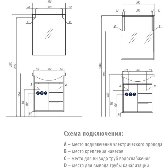 Механизм доводчика, Ящик, Полочка, Ручки, Зеркало-шкаф, Ножки, Тумба под раковину, Раковина