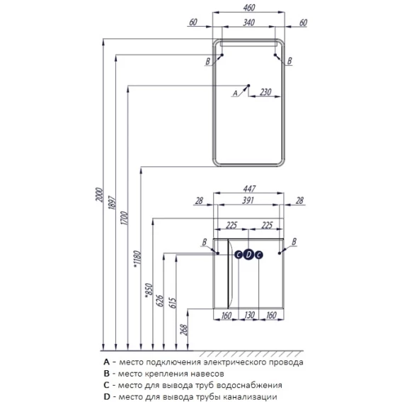 Механизм доводчика, Полочка, Подсветка, Ручка, Зеркало, Тумба под раковину, Раковина