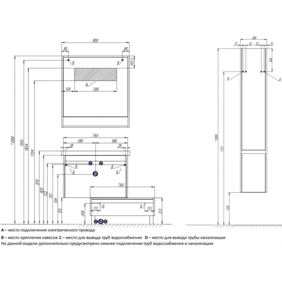 Механизм доводчика, Ящик, Полочка, Подсветка, Зеркало, Тумба под раковину, Раковина