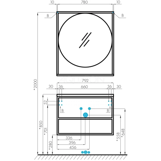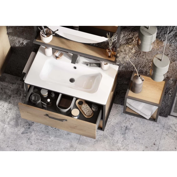 Механизм доводчика, Ящик, Полочка, Ручка, Полотенцедержатель, Зеркало, Тумба под раковину, Раковина