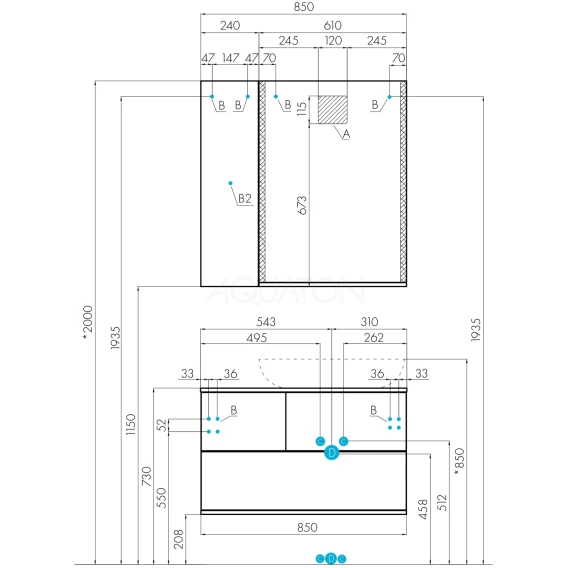 Ящик, Полочка, Подсветка, Система "Push-to-open", Зеркало, Столешница, Тумба под раковину, Раковина