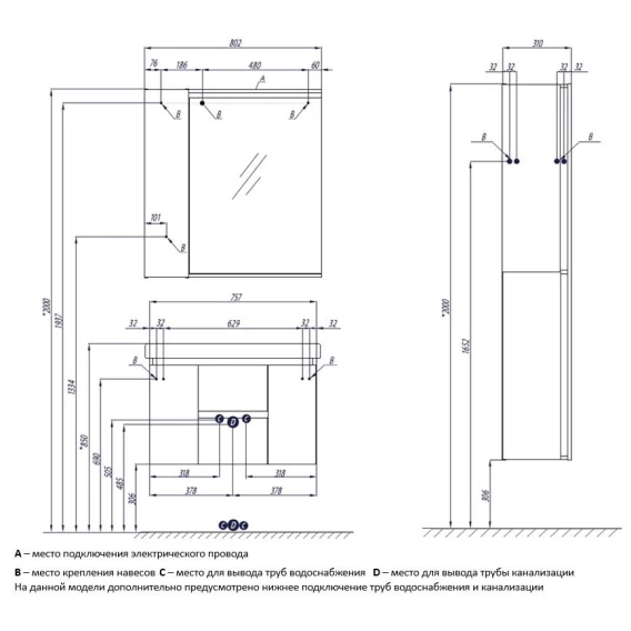 Механизм доводчика, Ящик, Полочка, Ручки, Подсветка, Зеркало-шкаф, Тумба под раковину, Раковина