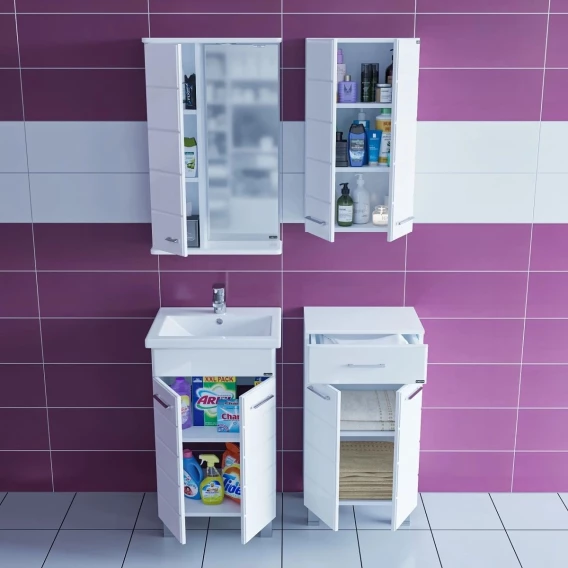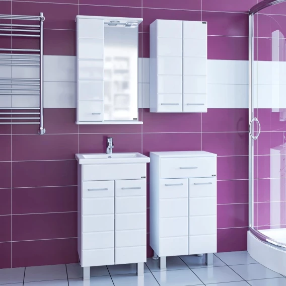 Механизм доводчика, Полочка, Ручки, Зеркало-шкаф, Выключатель, Розетка, Светильник, Ножки, Тумба под раковину, Раковина