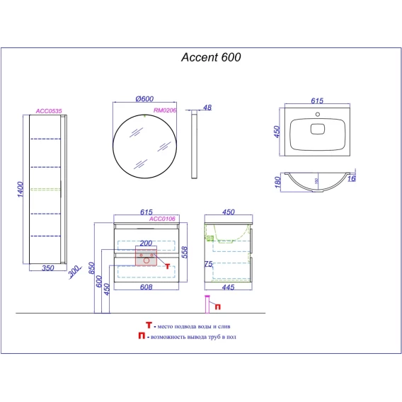 Комплект мебели белый глянец 60,8 см Aqwella 5 Stars Accent ACC0106W + Mal.06.04.D + RM0206W