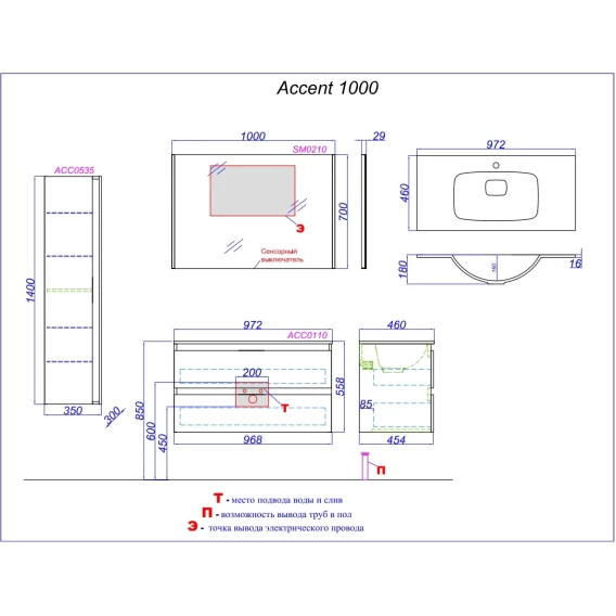Комплект мебели белый глянец 97,2 см Aqwella 5 Stars Accent ACC0110W + Mal.10.04.D + SM0210
