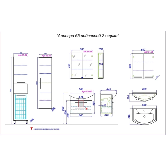 Комплект мебели белый глянец 66 см Aqwella Allegro Agr.01.06/2 + 4620008192475 + MC.04.06