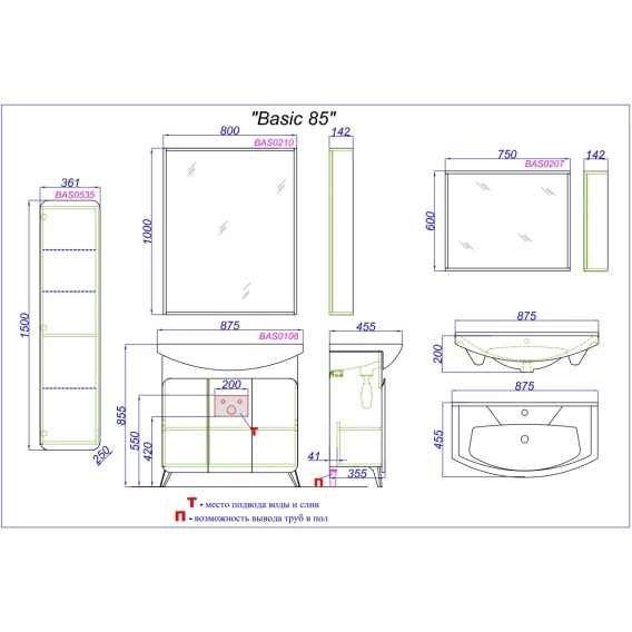 Механизм доводчика, Полочка, Ножки, Зеркало, Тумба под раковину, Раковина