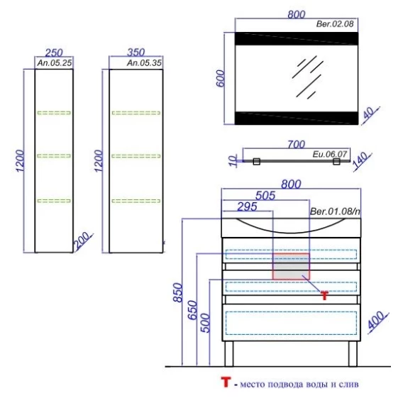 Механизм доводчика, Ящик, Подсветка, Ножки, Зеркало, Тумба под раковину, Раковина