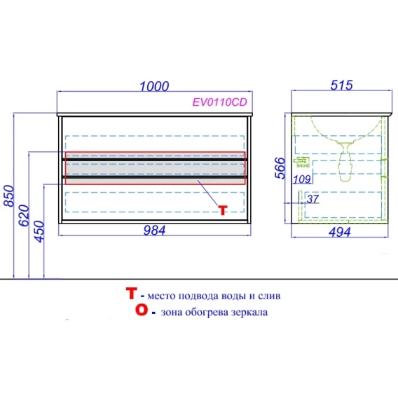 Механизм доводчика, Ящик, Подсветка, Сенсорный выключатель, Зеркало, Тумба под раковину, Раковина