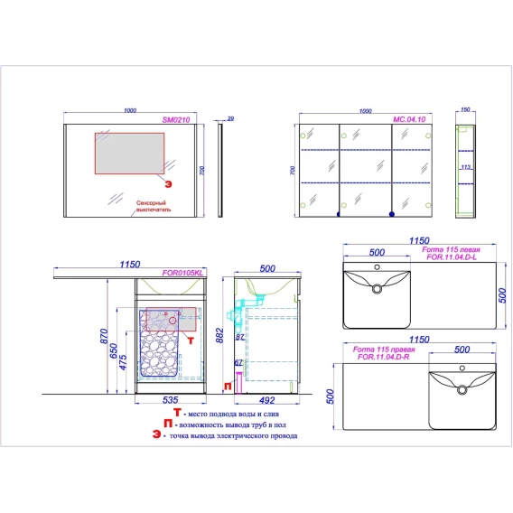 Механизм доводчика, Ящик, Подсветка, Сифон, Кронштейн, Сенсорный выключатель, Бельевая корзина, Зеркало, Тумба под раковину, Раковина