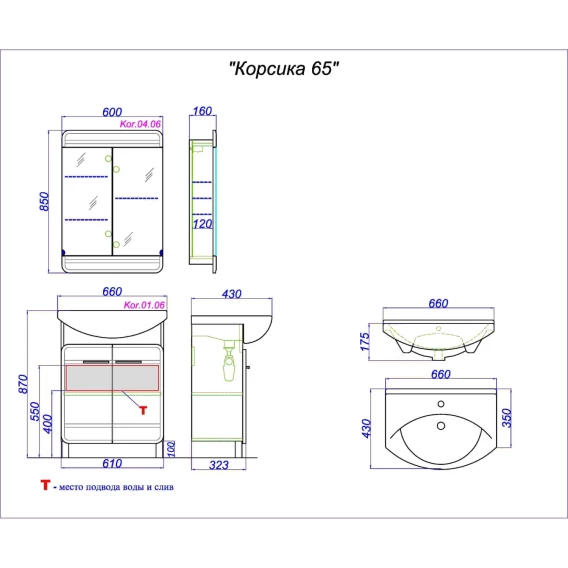 Комплект мебели белый глянец 66 см Aqwella Corsica Kor.01.06 + 4640021062296 + Kor.04.06