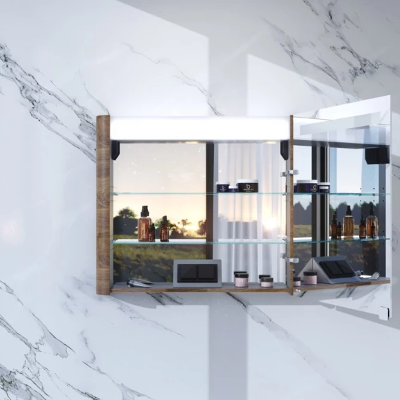 Механизм доводчика, Ящик, Полочка, LED подсветка, Зеркало-шкаф, Ручка, Розетка, Сенсорный выключатель, Тумба под раковину, Раковина