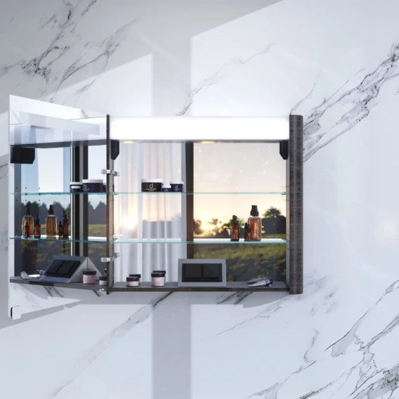 Механизм доводчика, Ящик, Полочка, LED подсветка, Зеркало-шкаф, Ручка, Розетка, Сенсорный выключатель, Тумба под раковину, Раковина