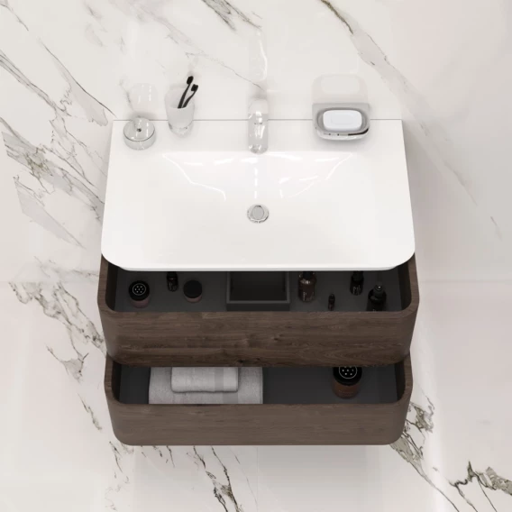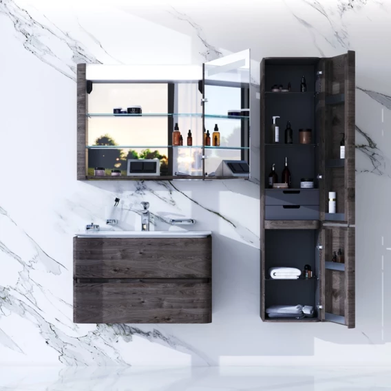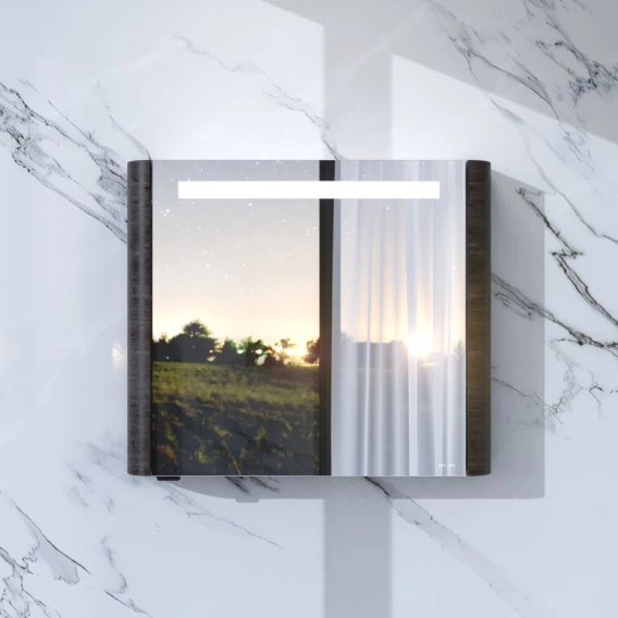 Механизм доводчика, Ящик, Полочка, LED подсветка, Зеркало-шкаф, Ручка, Розетка, Сенсорный выключатель, Тумба под раковину, Раковина