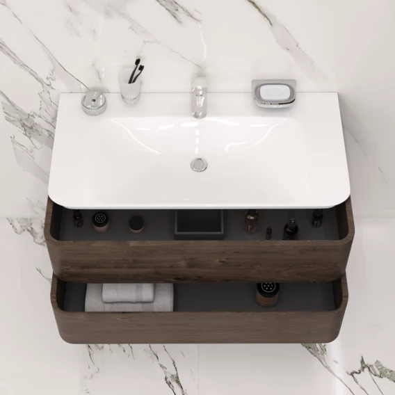 Механизм доводчика, Ящик, Полочка, Ручки, LED подсветка, Зеркало-шкаф, Розетка, Сенсорный выключатель, Тумба под раковину, Раковина