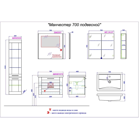 Механизм доводчика, Ящик, Ручки, Подсветка, Сенсорный выключатель, Зеркало, Тумба под раковину, Раковина
